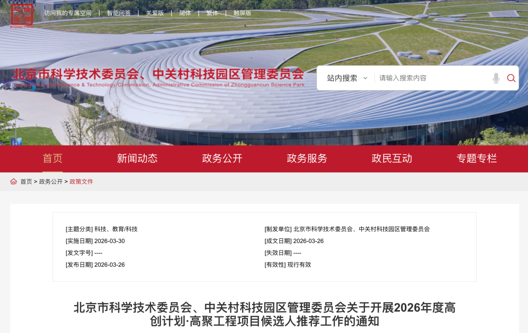北京市科学技术委员会、中关村科技园区管理委员会关于开展2026年度高创计划·高聚工程项目候选人推荐工作的通知