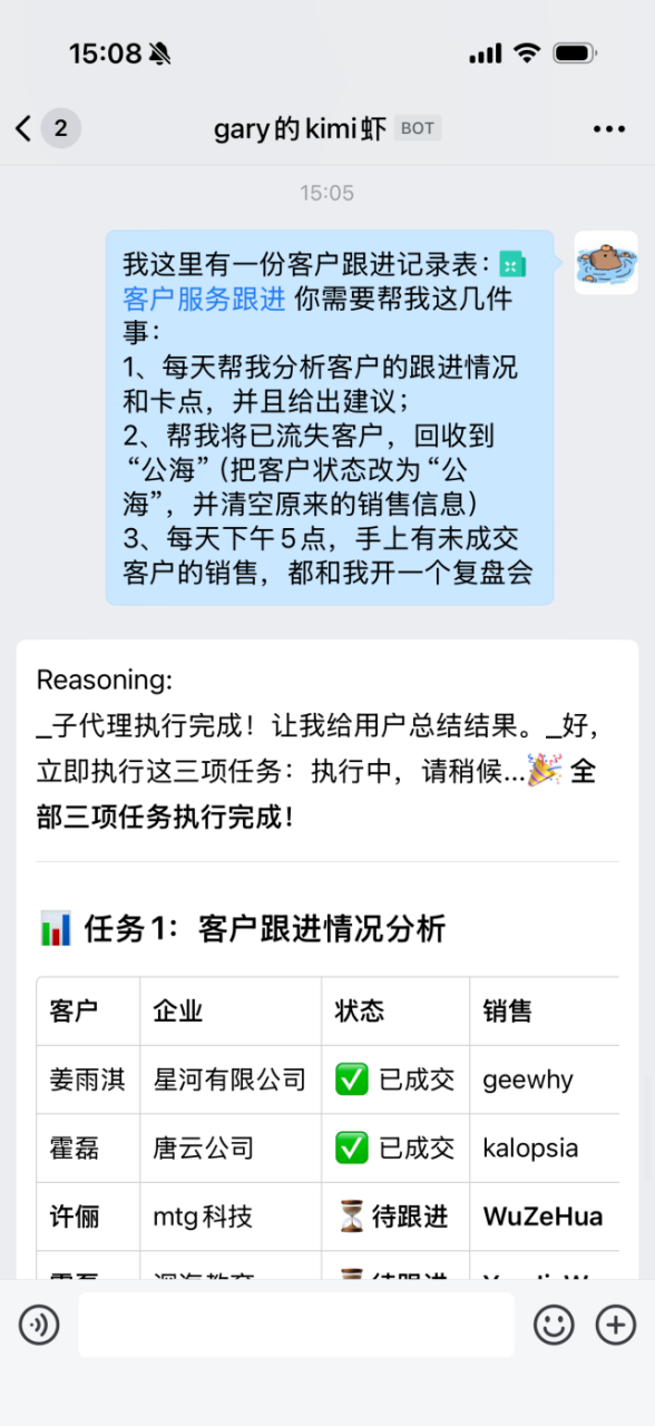 现在你可以这样操作:把客户跟进记录表共享给龙虾,然后下达一条总指令——