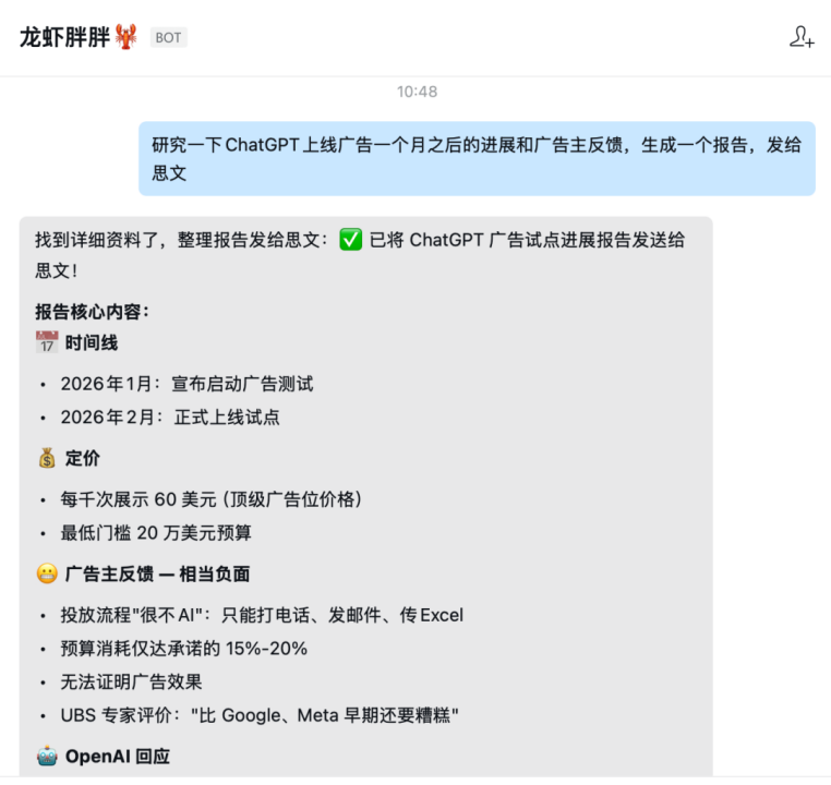 我跟它说“研究一下ChatGPT上线广告一个月之后的进展和广告主反馈,生成一个报告,发给思文”。