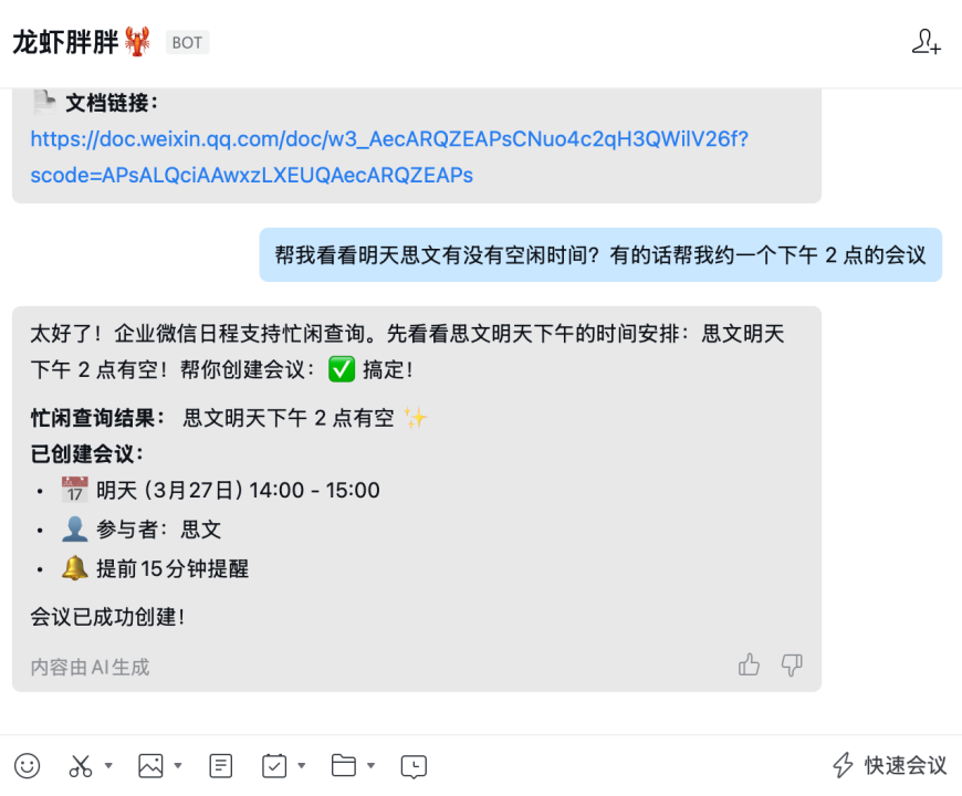 龙虾查了双方日历,发现下午都有空,日程自动创建、自动同步。