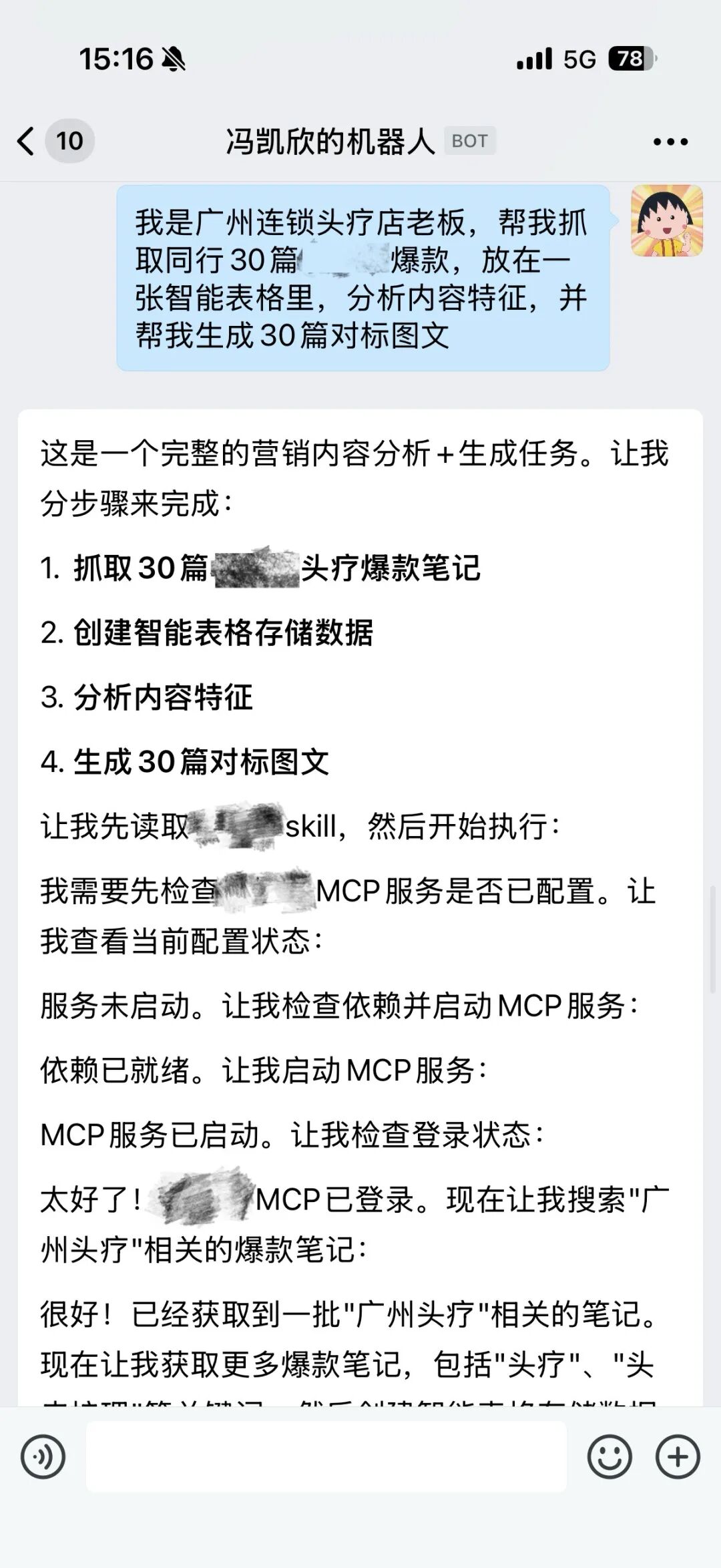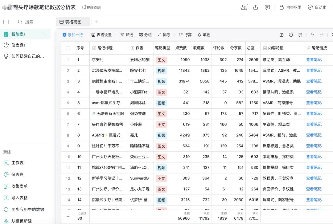 跟龙虾说:“我是广州连锁头疗店老板,帮我抓取同行30篇XX爆款,放在一张智能表格里,分析内容特征,并帮我生成30篇对标图文。”