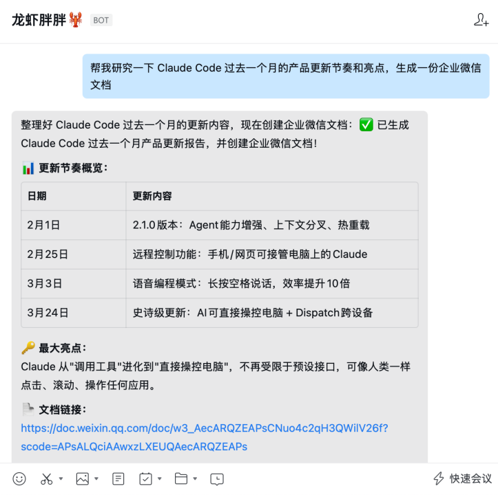 你在企业微信的对话框里跟龙虾说一句话,它就能开始干活。