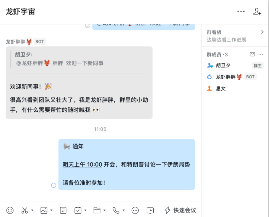 在多个群法通知也很简单,只需要给龙虾说“帮我在选题项目组群和龙虾宇宙群发一个通知:明天上午10:00 开会和特朗普讨论一下伊朗局势。”
