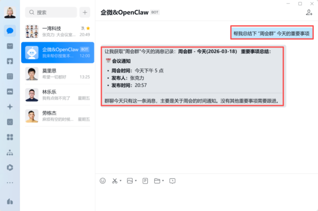 你跟龙虾说:“帮我总结一下周会群今天的重要事项。”