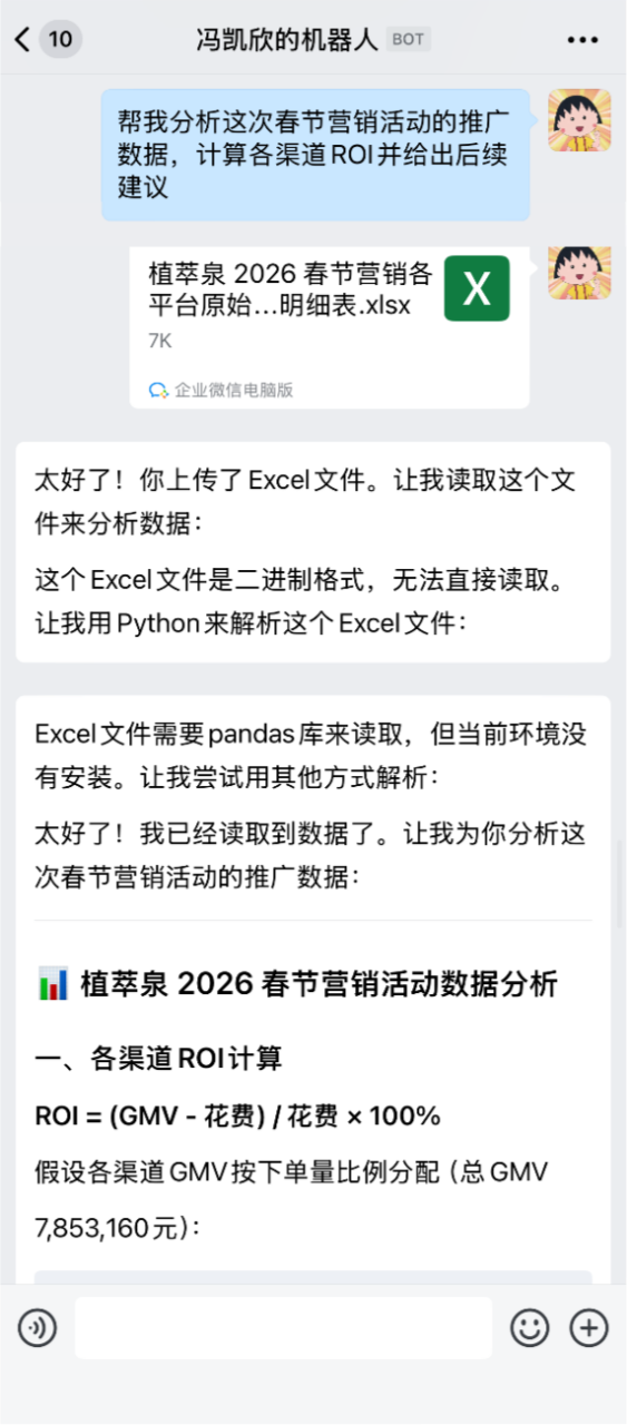 把数据表格发给龙虾,跟它说“帮我分析这次春节营销活动的推广数据,计算各渠道ROI并给出后续建议”。