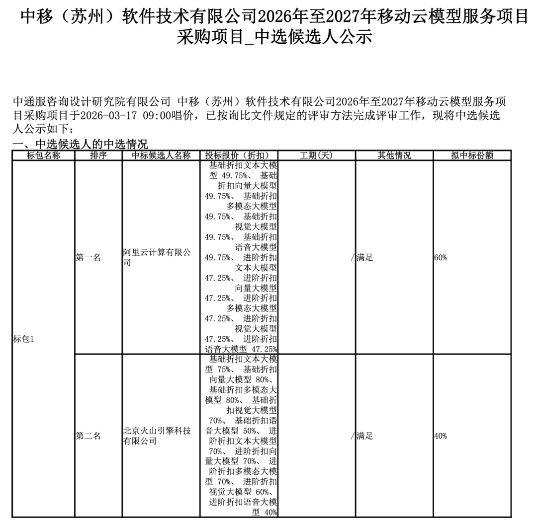 3月23日,中移(苏州)软件技术有限公司2026年至2027年移动云模型服务项目开标,阿里云和火山引擎中标,中标份额分别是60%和40%,项目金额约2547万元。