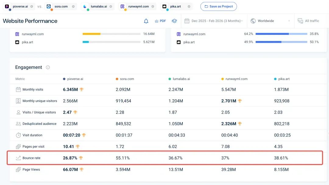 其次是极为硬核的用户行为数据。 根据 Similarweb 的监测显示,PixVerse 的 Bounce Rate(跳出率)显著低于 Sora。这意味着用户进入后,不是“看一眼就走”,而是产生了更深度的互动与创作。谢旭璋在访谈中对此给出了更深层的解释:PixVerse 通过模板和工作流设计,让用户留了下来。截至 2025 年 10 月,其全球总用户数已超 1 亿,月活(MAU)突破 1600 万,30 日留存远超行业平均水平。