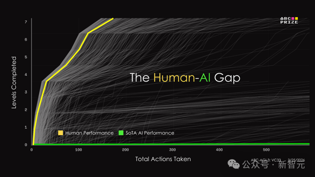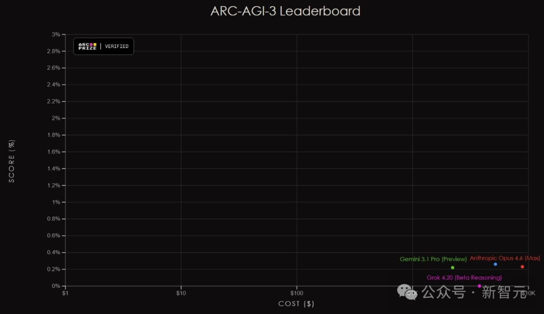 【导读】今夜,整个AI圈震动了。全球最难AGI测试ARC-AGI-3一上线,就把全球顶尖AI打到集体失声,人类满分通关,最强模型Opus 4.6得分仅0.2%,还不到1%。AI这是一夜被打回「原始人」了。