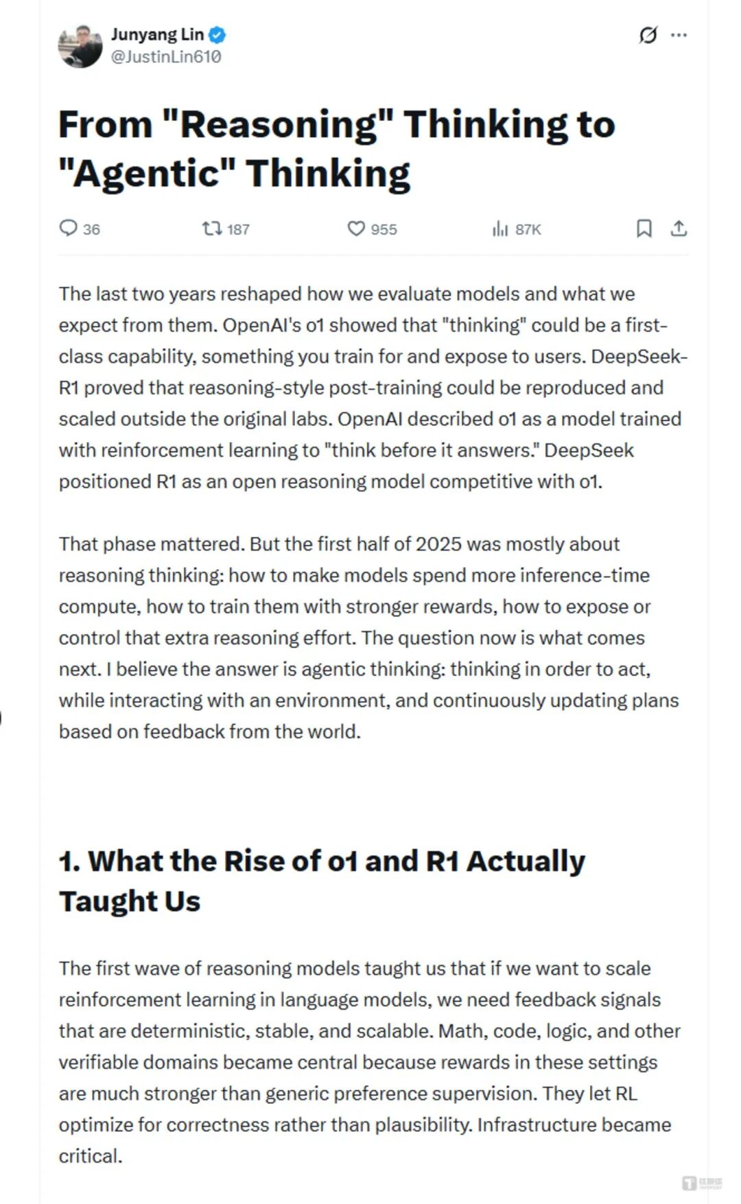 深层次的转变是从推理式思维转向行动式思维:从更长时间的思考,转变为为了采取行动而进行的有序思考。培训的核心对象也随之发生了变化——如今,关注的焦点已不再是单纯的模型本身,而是“模型+环境”这一系统,更具体地说,是智能体及其周围的生态系统。这使得哪些研究成果最为关键也发生了改变:固然,模型架构和训练数据依然至关重要;但与此同时,环境设计、部署基础设施、评估器的稳健性,以及多个智能体之间协同互动所依赖的各类接口,也都变得同样重要。这也重新定义了“良好思考”的含义:在现实世界的约束条件下,最能持续推动行动的有效轨迹,而非单纯追求最长或最显眼的轨迹。