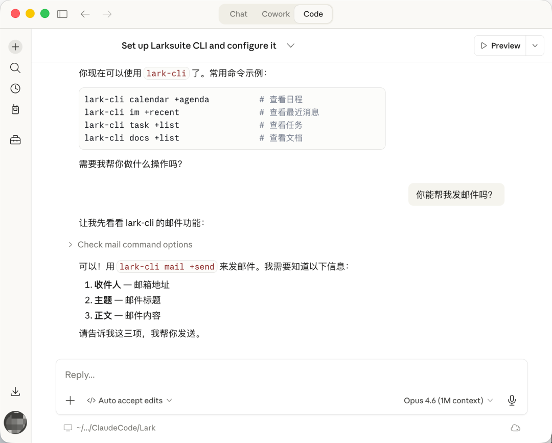 Claude Code 里使用 lark-cli,查日程、查消息、发邮件,直接跟 Agent 说就行