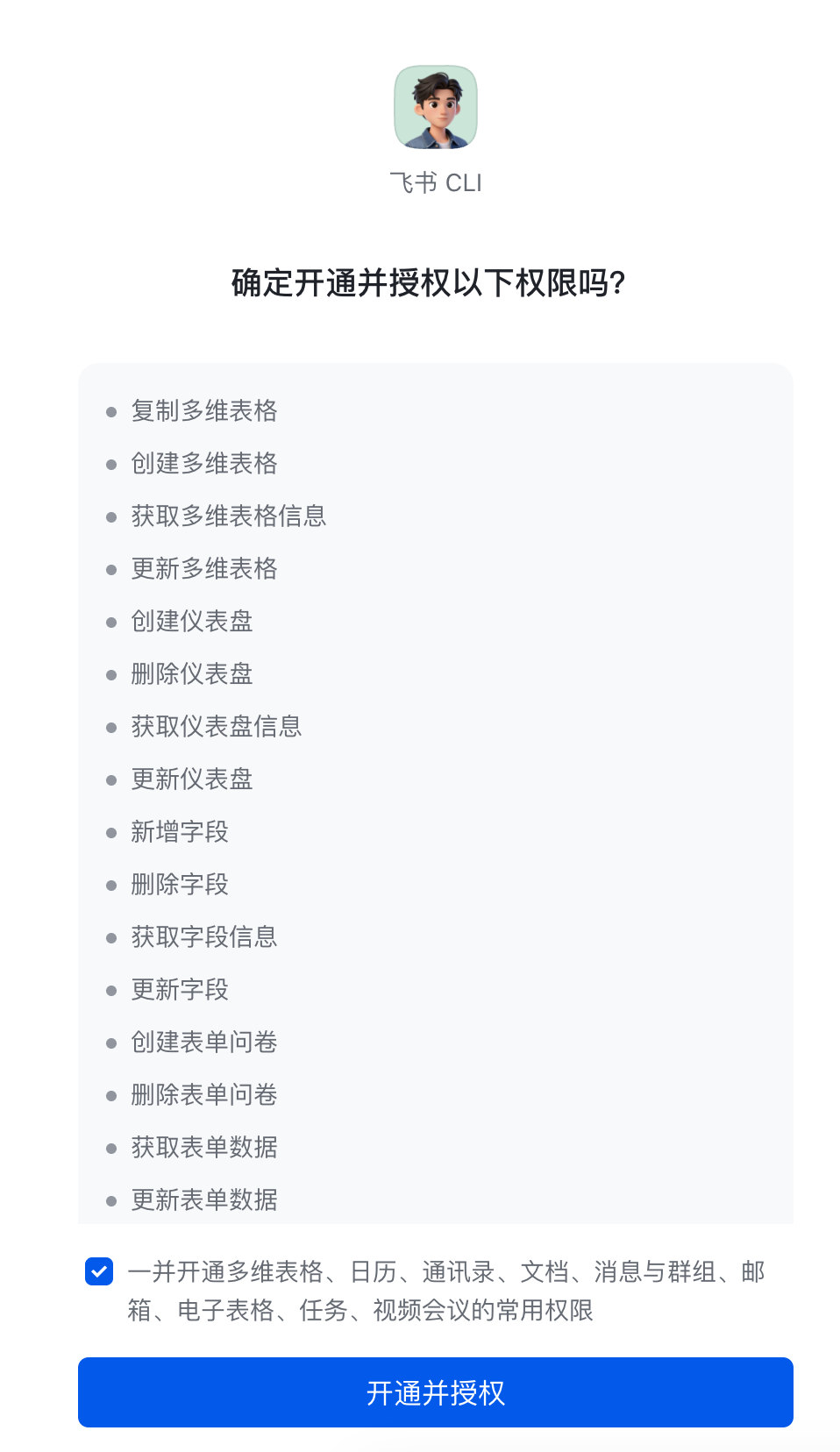 第二步 手机扫码,在飞书里一键授权。多维表格、日历、通讯录、文档、消息、邮箱、电子表格、任务、视频会议的常用权限一次开通