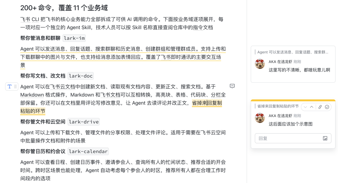 Agent 可以创建新文档、读取现有文档内容、更新正文、搜索文档。基于 Markdown 格式操作,Markdown 和飞书文档可以互相转换,高亮块、表格、代码块、分栏全部保留。你还可以在文档里用评论写修改意见,让 Agent 去读评论并改正文,省掉来回复制粘贴的环节