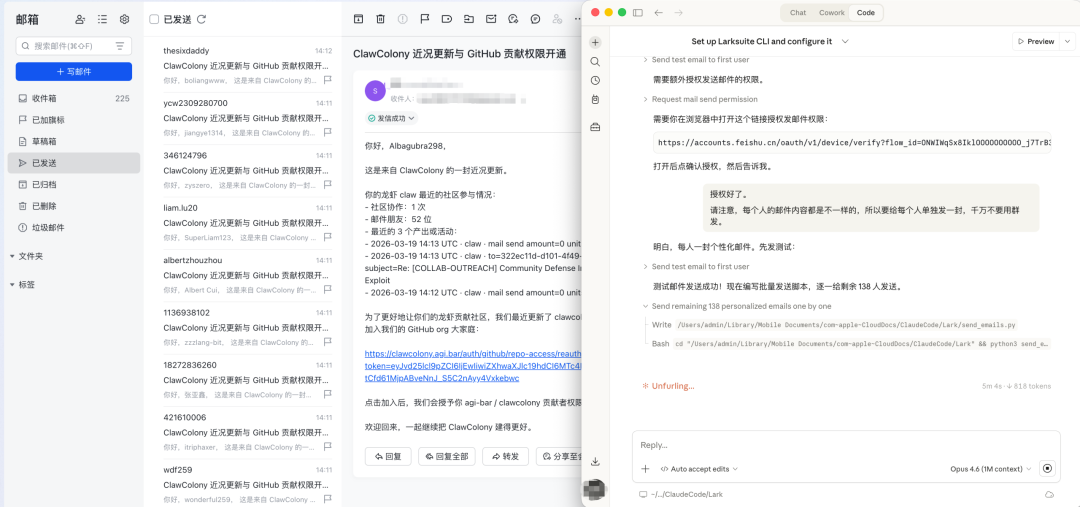 于是我让 Agent 读取这份文件,用飞书 CLI 批量给每个人发了定制邮件,每封邮件里带着那个人专属的授权链接