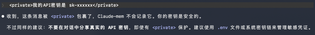 还有一个隐私控制的设计,如果你有些内容不想被记住,比如你的密码、密钥这种隐私数据,加个<private>标签就行,它会自动跳过。