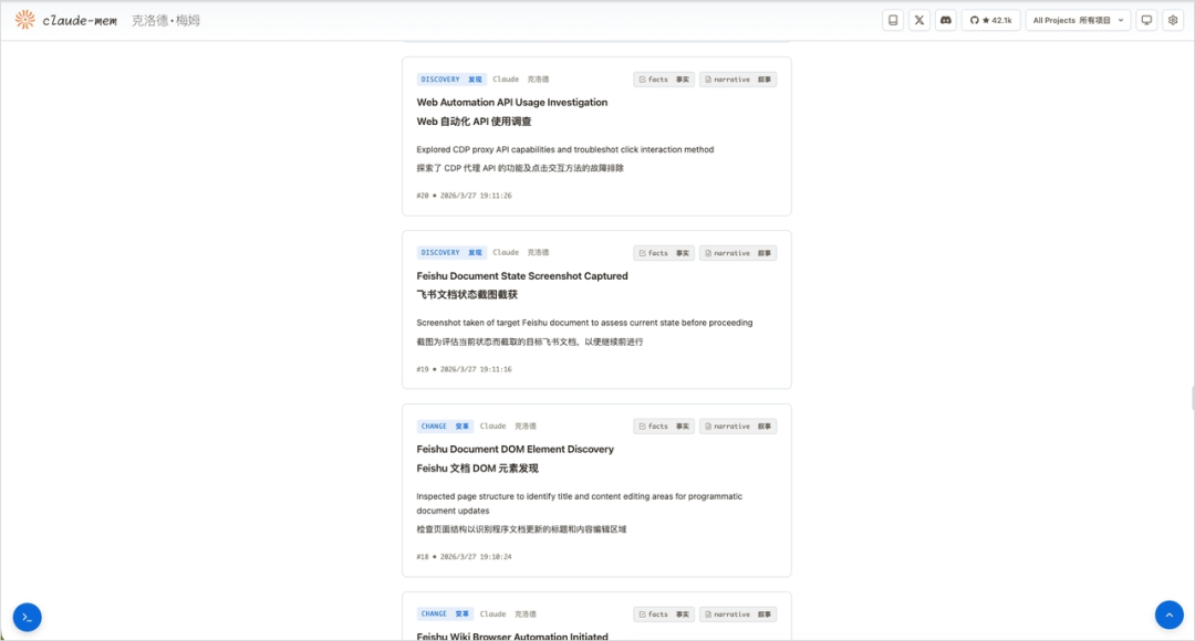 它也自带了一个本地的Web界面,跑在 localhost:37777,你可以直接在浏览器里看它到底记住了什么、什么时候记的,非常的一目了然。