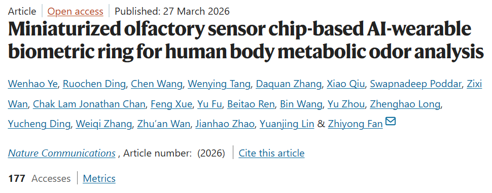 相关研究以「Miniaturized olfactory sensor chip-based AI-wearable biometric ring for human body metabolic odor analysis」为题,于 2026 年 3 月 27 日发布在《Nature Communications》。
