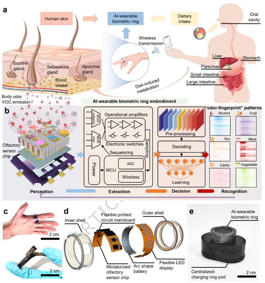 来自香港科技大学等的研究团队提出了一款基于微型嗅觉传感芯片的 AI 可穿戴生物识别戒指,能够通过 VOCs 非侵入式读取饮食和活动状态。整套系统的核心传感器面积仅 0.0081 mm²,却能准确识别六类饮食、三种运动状态,甚至能定量预测酒精摄入量,并通过 AI 健康助手提供个性化建议。