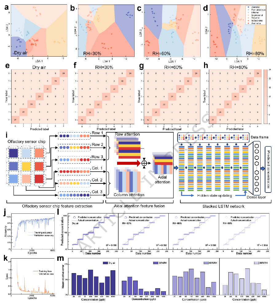 器件性能在多种气体、湿度环境之下均保持极高的精度,代表性的丙酮预测在训练中验证精度达到 98.80%,不同湿度下的决定系数均高于 0.990;对复杂混合气体,KNN 的 AUC 达到 0.985。