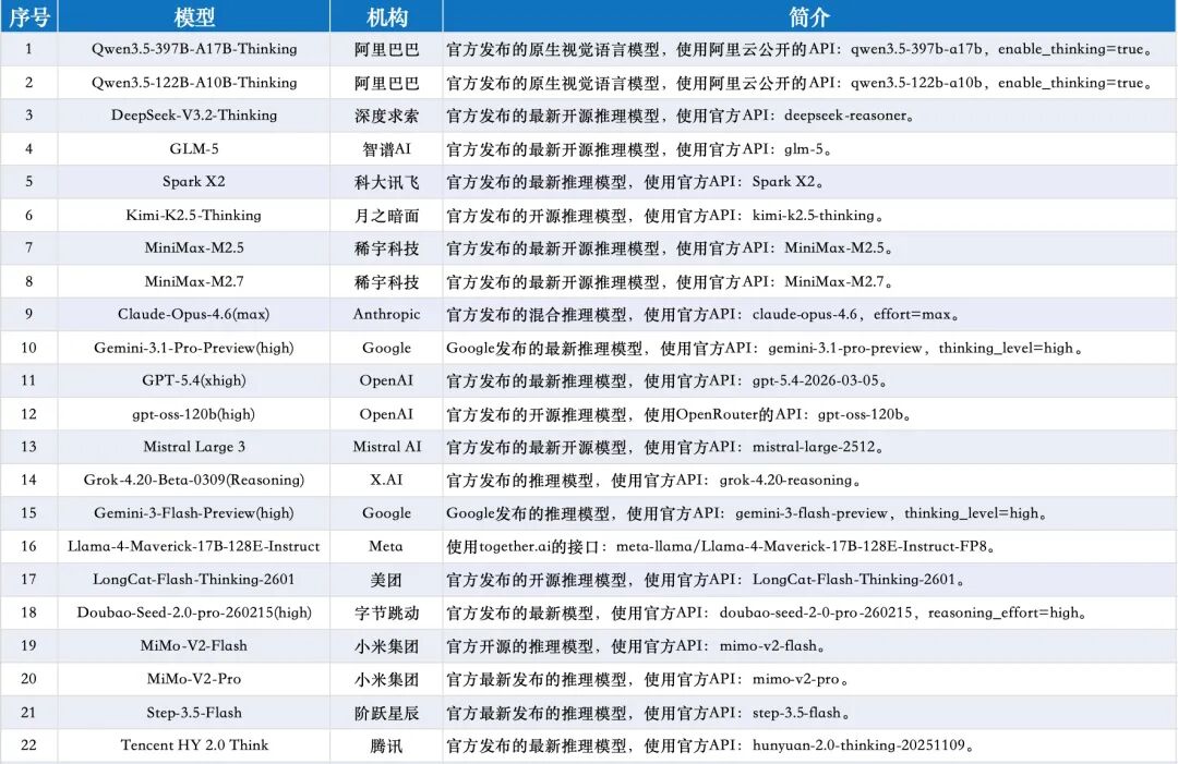 国内模型中,Doubao-Seed-2.0-pro-260215(high)和Qwen3.5-397B-A17B-Thinking均取得84.87分,并列全球第4;MiMo-V2-Pro(84.03)、Qwen3.5-122B-A10B-Thinking(82.35)、Kimi-K2.5-Thinking(81.51)也进入全球前10,与海外头部模型具备一定的竞争力。