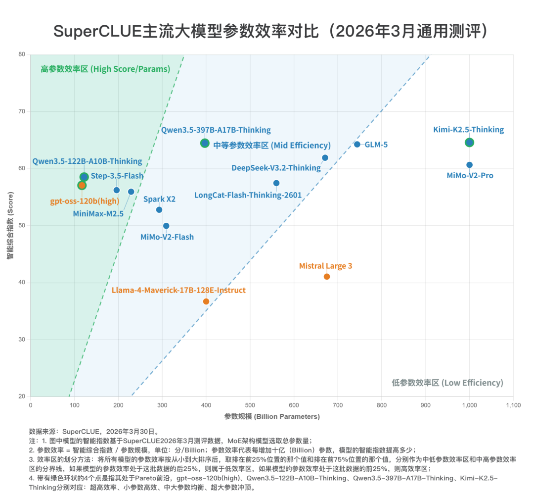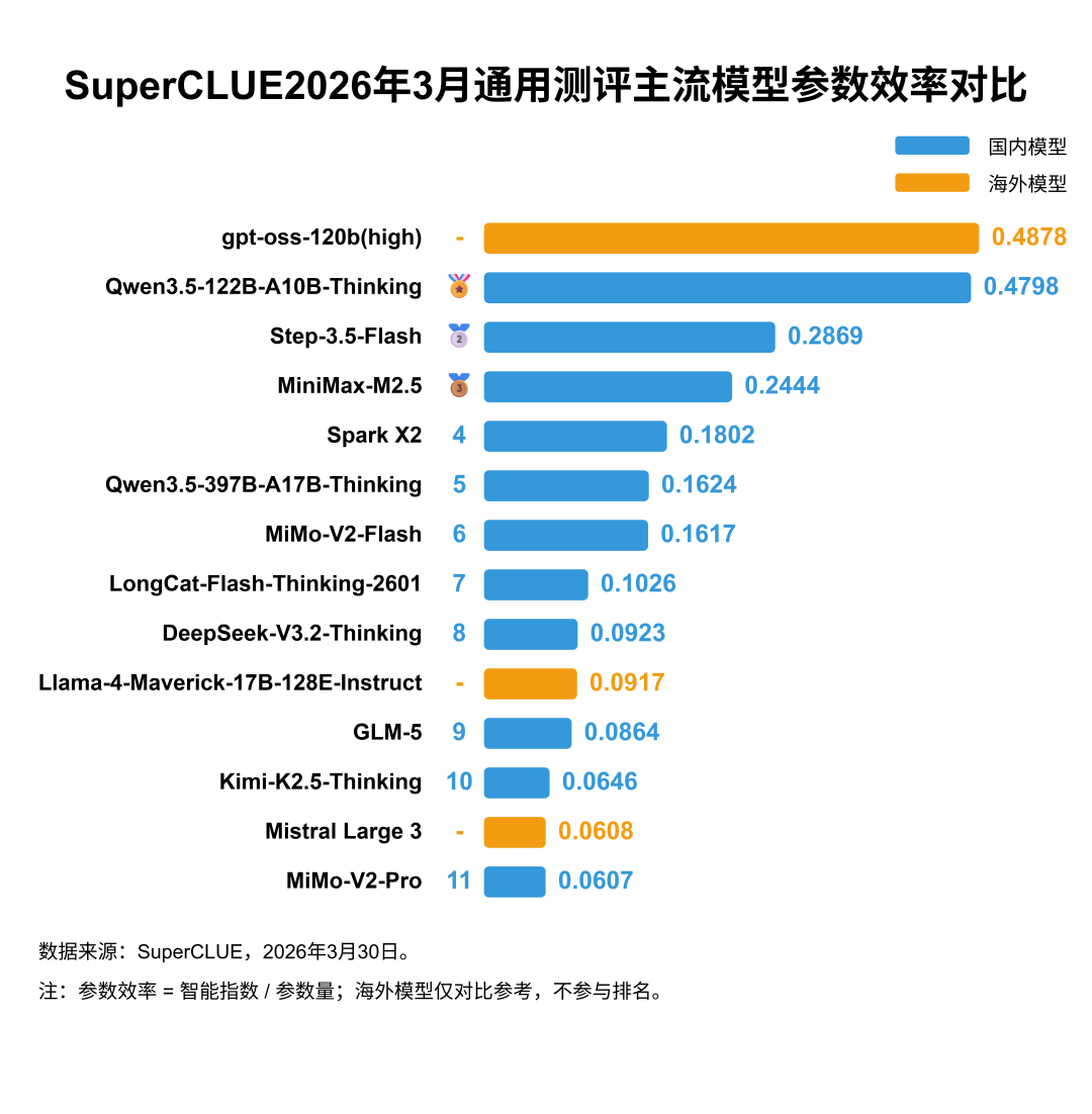 七、SuperCLUE主流大模型参数效率对比(2026年3月通用测评)