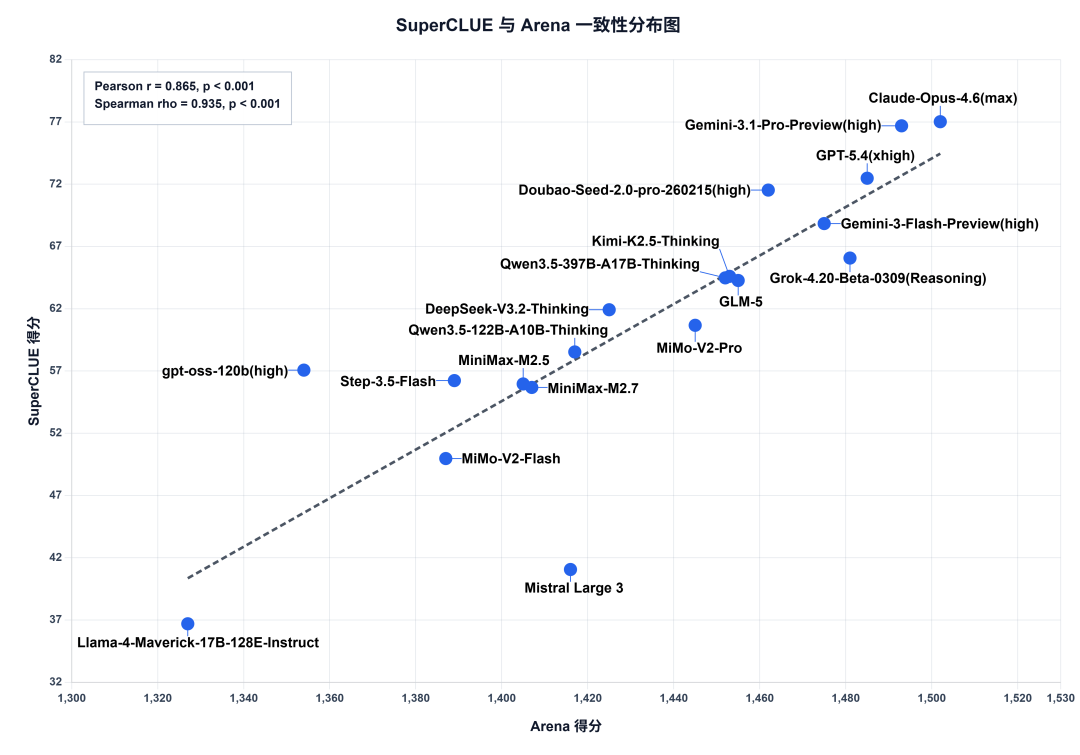 我们将SuperCLUE得分与Arena得分进行相关性计算,得到: