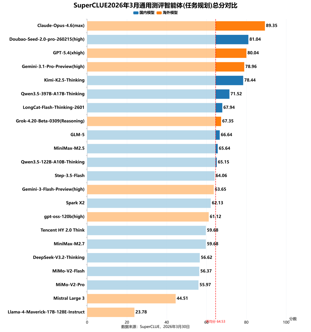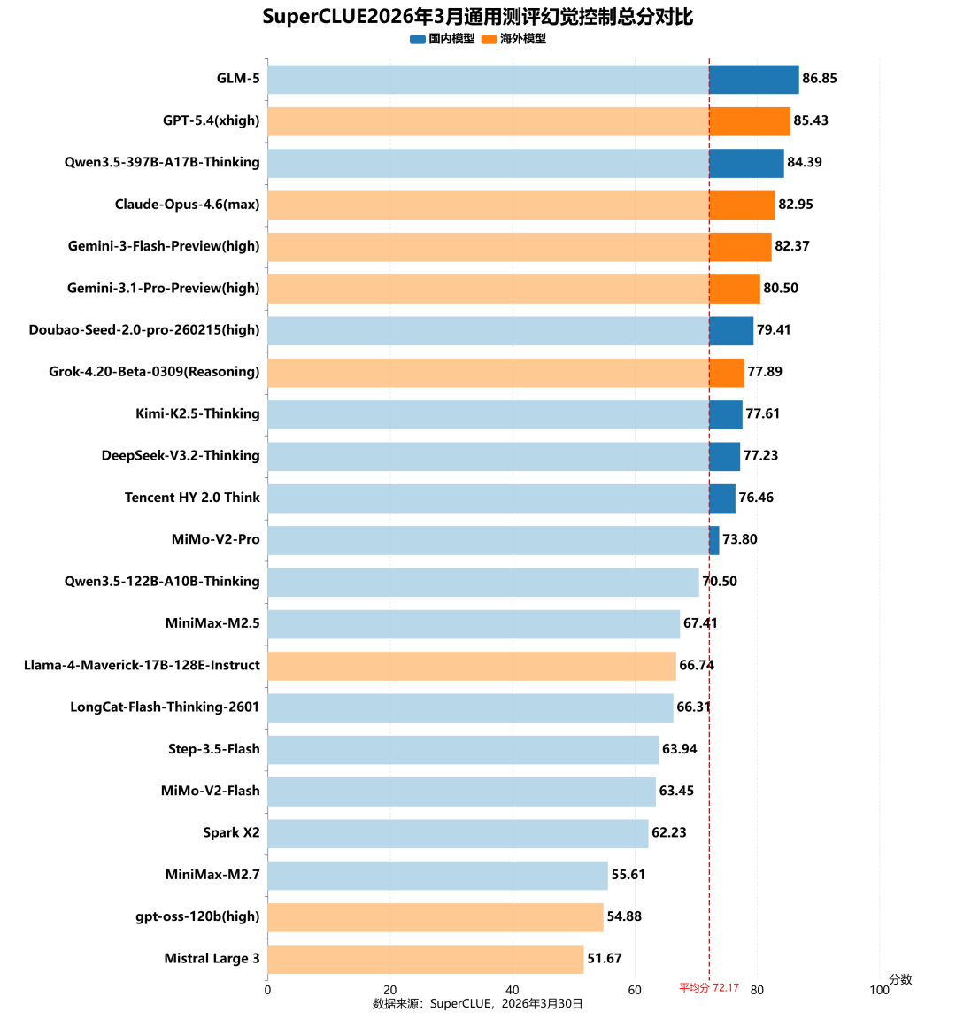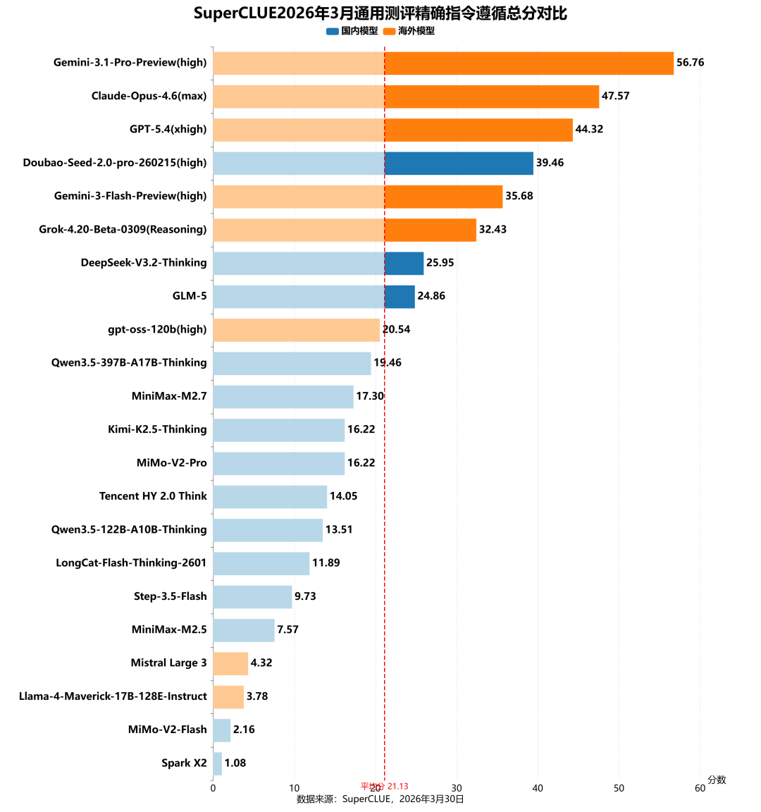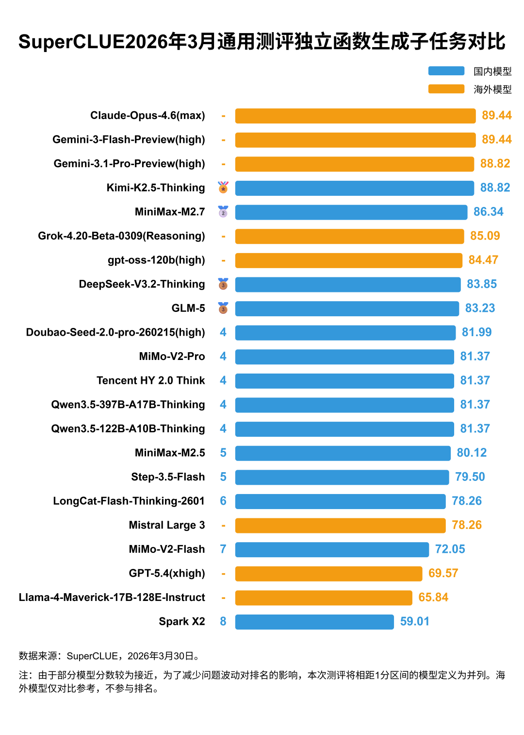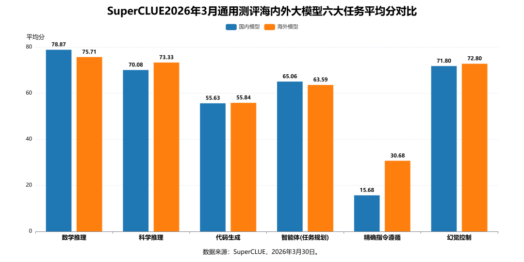 中文大模型测评基准SuperCLUE持续对国内外大模型的发展趋势和综合效果进行实时跟踪,本次2026年3月通用基准测评共有22个国内外模型参与,测评集包括六大任务:数学推理、科学推理、代码生成、智能体(任务规划)、精确指令遵循、幻觉控制,共702题。