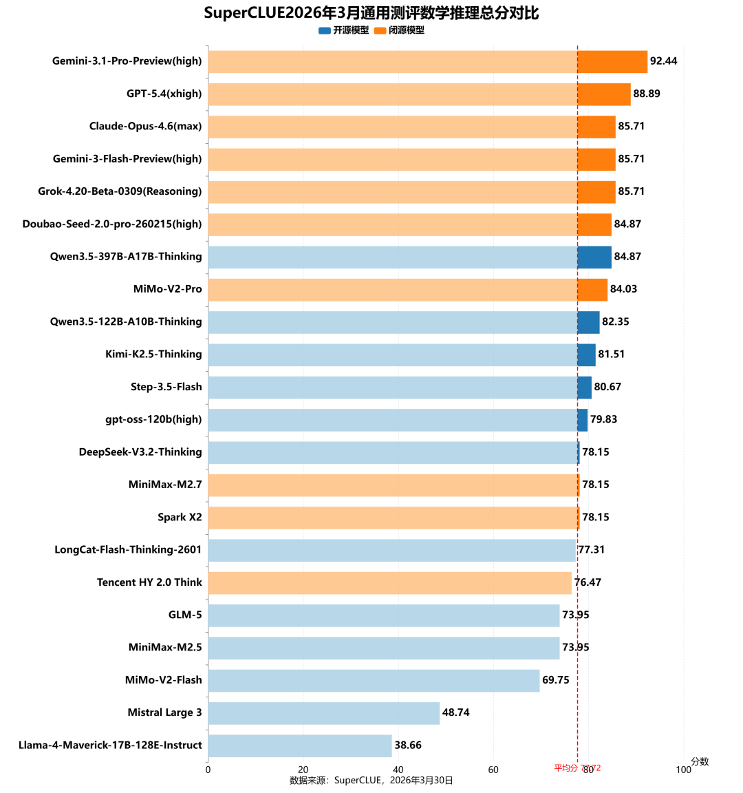 数学推理任务的Top6均为闭源模型,Gemini-3.1-Pro-Preview(high)以92.44分登顶,GPT-5.4(xhigh)(88.89)、Claude-Opus-4.6(max)(85.71)、Gemini-3-Flash-Preview(high)(85.71)、Grok-4.20-Beta-0309(Reasoning)(85.71)紧随其后,分数均超过85分。Top10中闭源模型占7席,开源模型仅占3席,且位置靠后;闭源模型整体平均分(84.01)显著高于开源模型(72.48),在数学推理任务上保持着显著的优势。