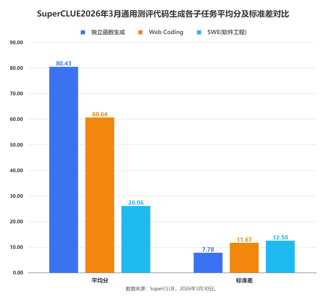 (4)SuperCLUE2026年3月通用测评代码生成各子任务平均分及标准差对比