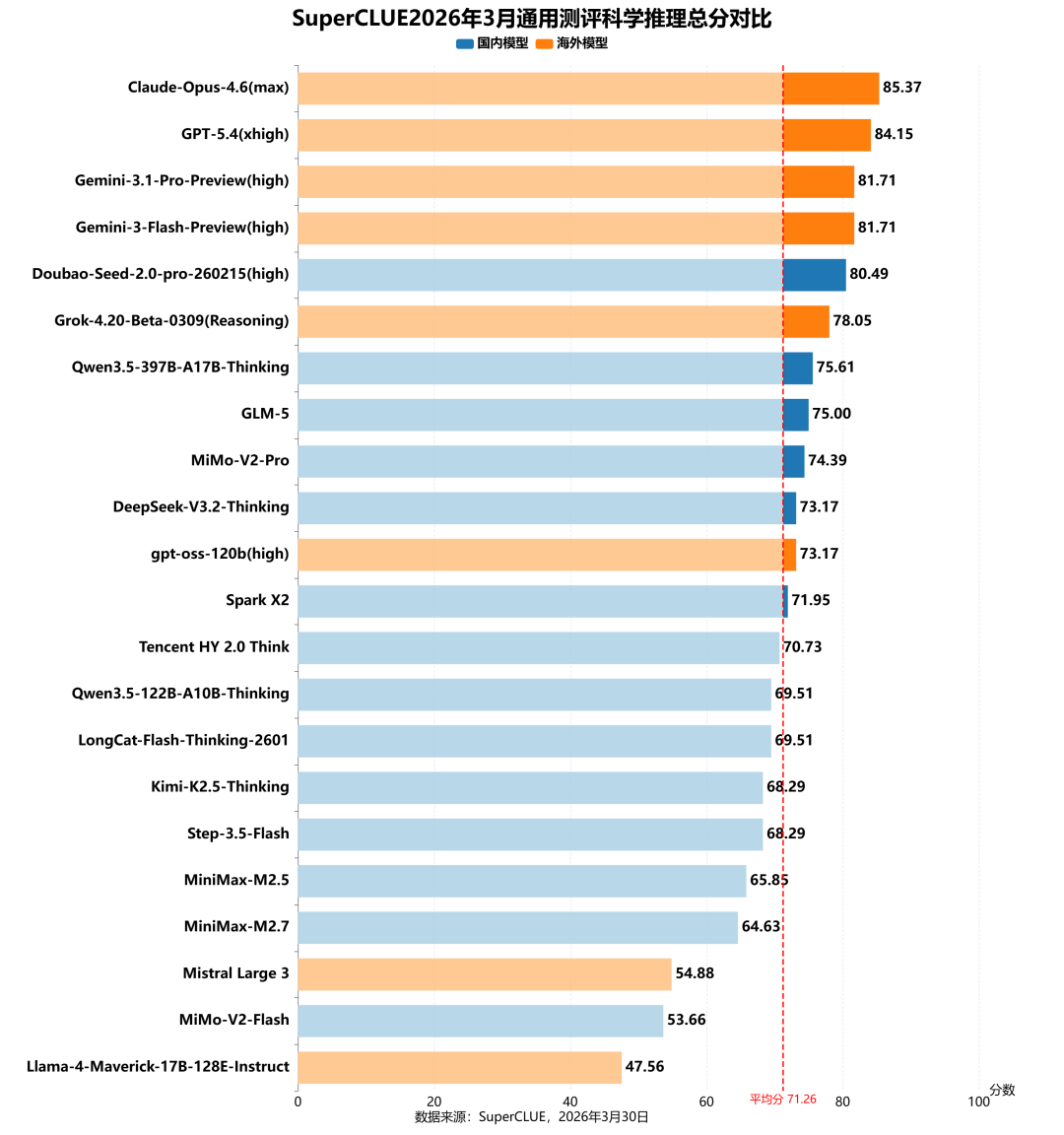 在科学推理任务中,海外模型包揽前四名,Claude-Opus-4.6(max)以85.37分位居榜首,GPT-5.4(xhigh)、Gemini-3.1-Pro-Preview(high)、Gemini-3-Flash-Preview(high)紧随其后,分数均超81分。国内仅有Doubao-Seed-2.0-pro-260215(high)以80.49分跻身前五,展现出国产模型在科学推理领域的强劲追赶势头。国内多数模型(如Qwen3.5系列、GLM-5、MiMo-V2-Pro等)分数集中在68-76分区间,紧贴平均线上下分布,整体呈现稳健的中部梯队特征。