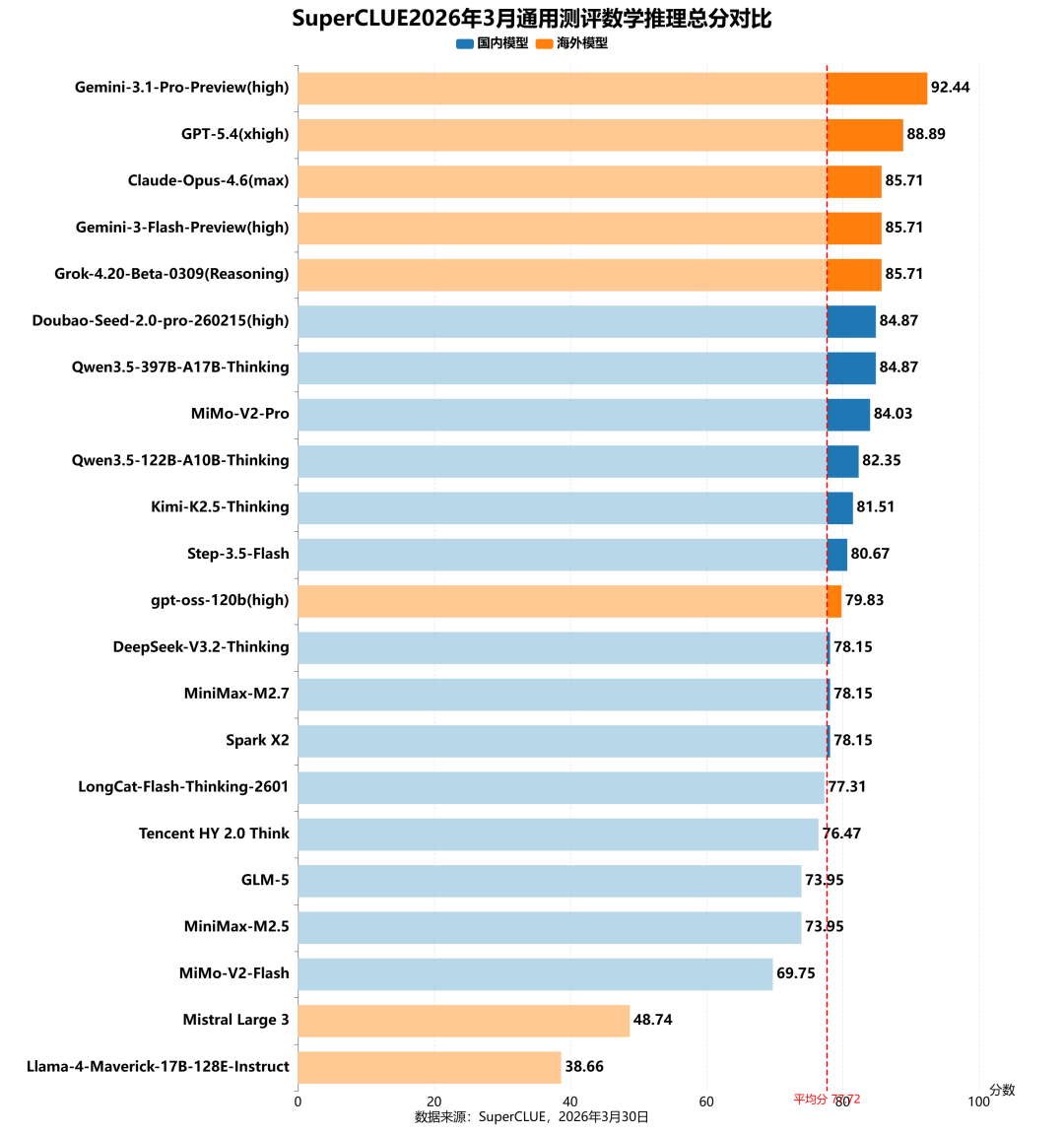 在数学推理任务中,海外模型包揽前三名:Gemini-3.1-Pro-Preview(high)以92.44分登顶,GPT-5.4(xhigh)、Claude-Opus-4.6(max)等模型紧随其后,分数均超过85分,形成了明显的第一梯队。