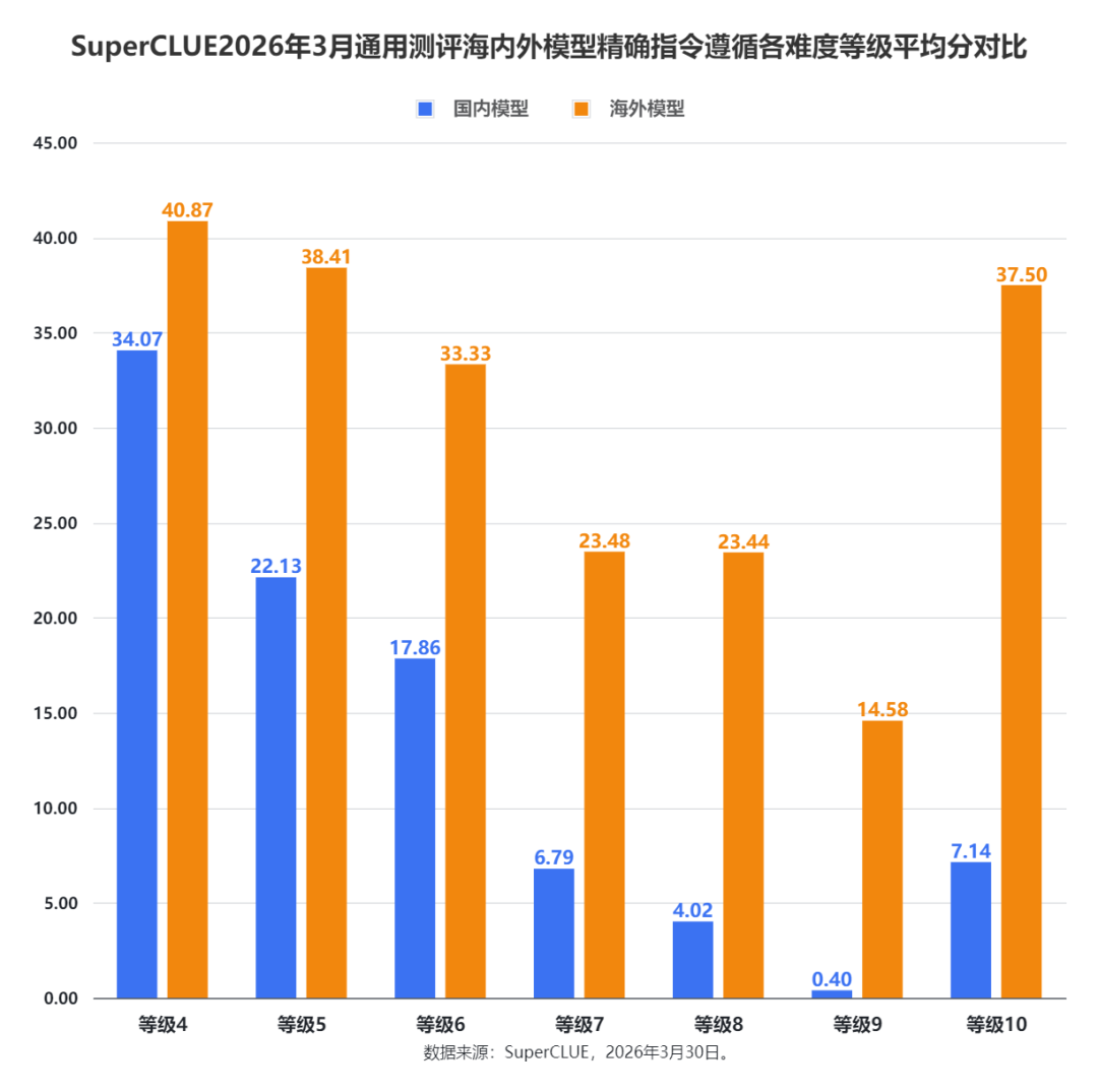 SuperCLUE2026年3月通用测评精确指令遵循任务各难度等级平均分对比