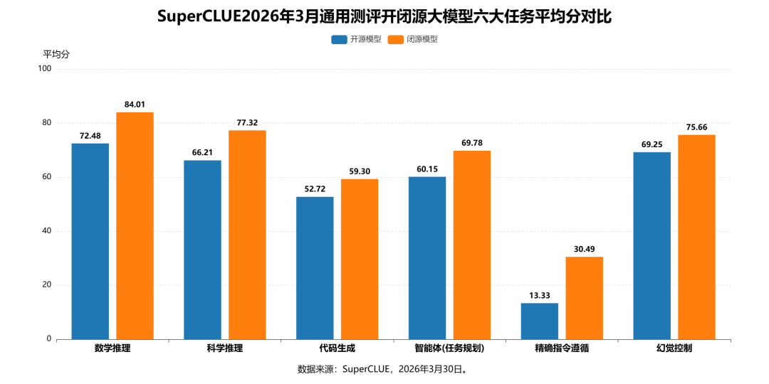 在本次测评的全部六项任务中,闭源模型平均分均高于开源模型,尤其在精确指令遵循任务上差距最大,闭源模型领先开源模型近17分;数学推理、科学推理、智能体(任务规划)、幻觉控制等任务的分差也均在10分以上,体现出闭源模型在复杂任务与顶尖性能上的稳固优势。
