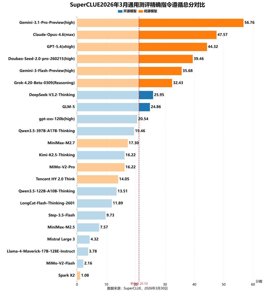 精确指令遵循的榜单前五名均为闭源模型,Gemini-3.1-Pro-Preview(high)以56.76分登顶,Claude-Opus-4.6(max)(47.57)、GPT-5.4(xhigh)(44.32)、Doubao-Seed-2.0-pro-260215(high)(39.46)、Gemini-3-Flash-Preview(high)(35.68)、Grok-4.20-Beta-0309(Reasoning)(32.43)紧随其后;开源最佳模型DeepSeek-V3.2-Thinking仅以25.95分位列第七,与第一名闭源模型差距超过30分;开源模型分数普遍偏低,与闭源模型在指令理解与执行精度上存在显著差距。