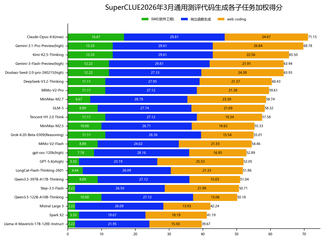 2. 绿色条形中间的数字为SWE(软件工程)任务加权后的分数,蓝色条形中间的数字为独立函数生成任务加权后的分数,橙色条形中间的数字为Web Coding任务加权后的分数,条形图最右边的数字为三大子任务加权求和得到的总分;