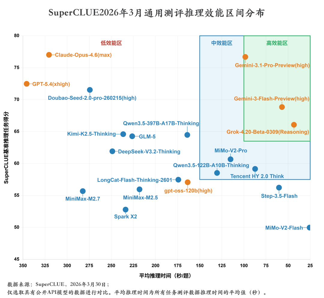 模型整体呈现出 “推理得分越高,平均推理耗时越长” 的经典正相关权衡关系。低分段(60分以下)模型多集中于横轴右侧(耗时<150秒/题),如MiMo-V2-Flash(49.97分/25.64秒)、Step-3.5-Flash(56.23分/60.29秒);中分段(60-70 分)模型集中于横轴中部(耗时100-250秒/题),如 Qwen3.5-397B-A17B-Thinking(64.48分/164.06秒)、GLM-5(64.27分/226.39秒);高分段(70分以上)模型除高效能区外,全部集中于横轴左侧(耗时>250秒/题),如GPT-5.4 (xhigh)(72.48分/345.82秒)、Claude-Opus-4.6 (max)(77.02分/320.52秒),整体符合 “质量与速度不可兼得” 的规律。