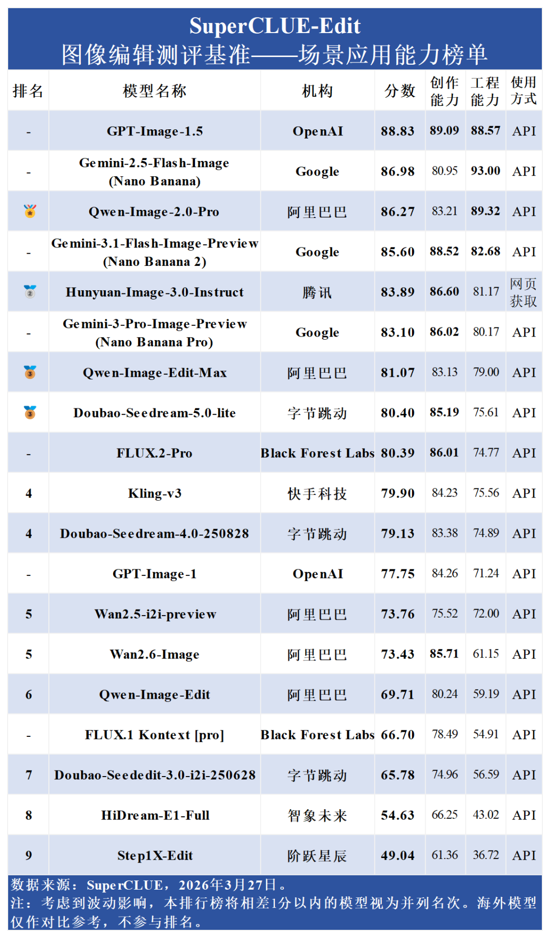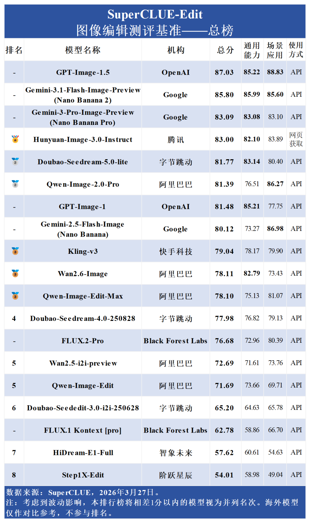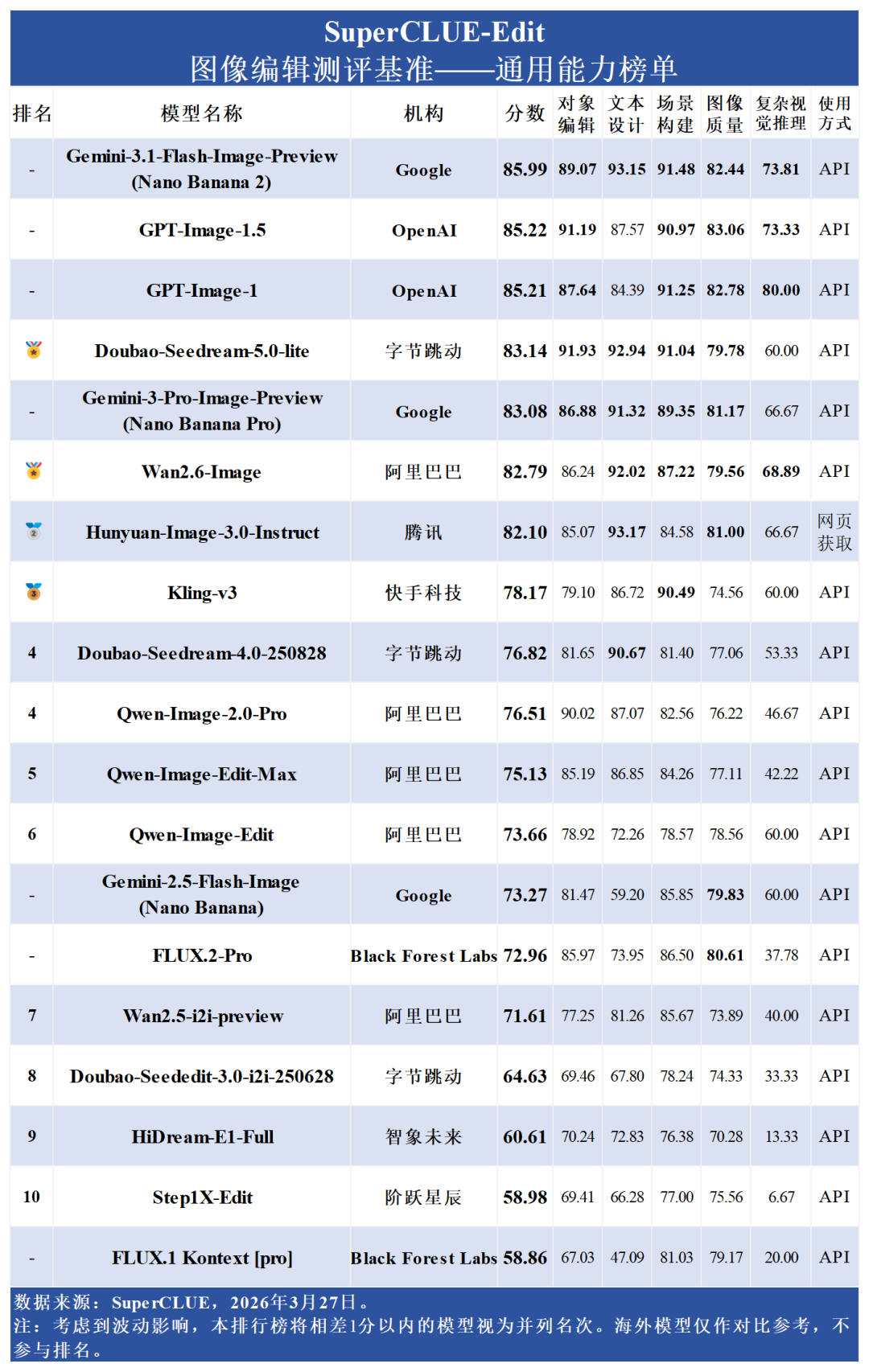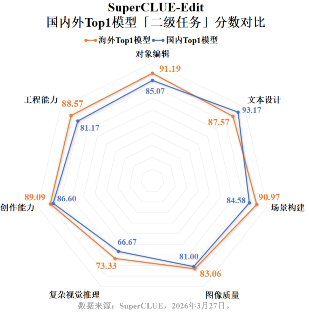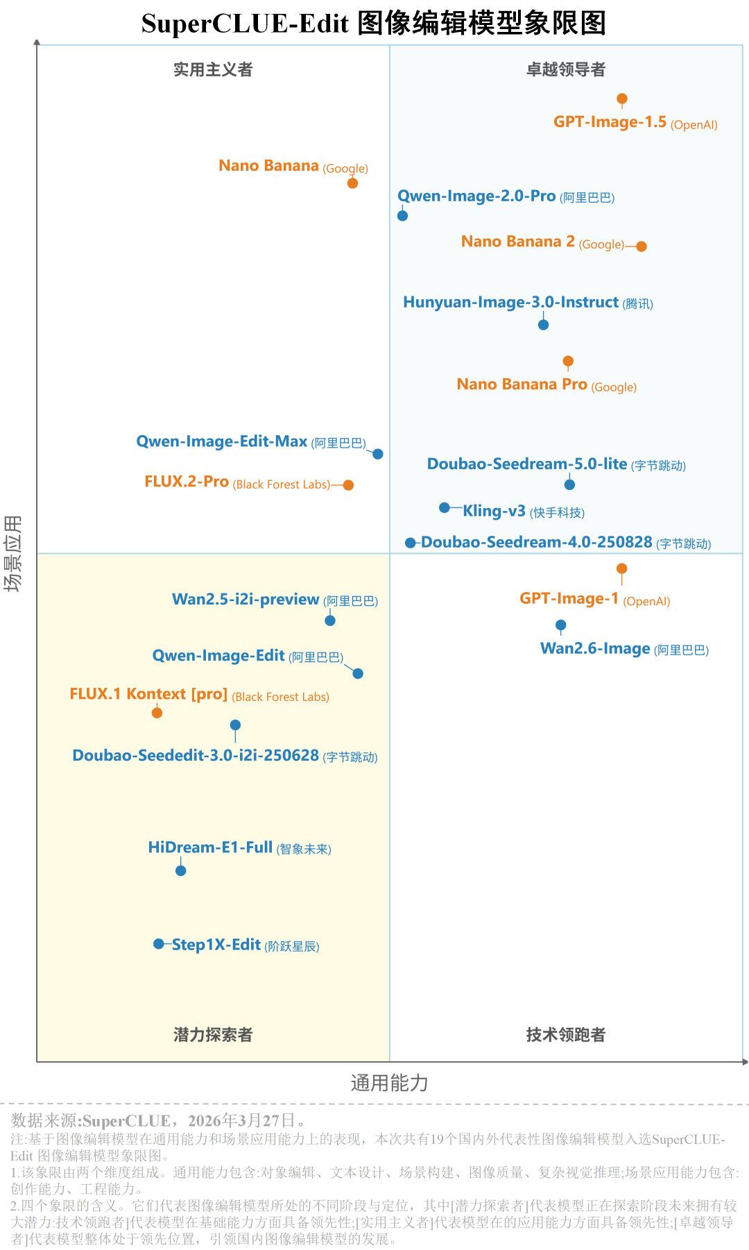2026 年 3 月,SuperCLUE-Edit 中文原生图像编辑最新测评榜单发布。本次沿用 「图像编辑」测评基准中文方案发布,覆盖通用能力和应用场景两大核心维度,从多角度揭示图像编辑模型在语义理解、创意表达与视觉工程能力上的真实水平。