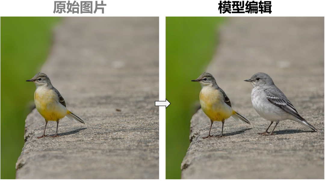 -----评价开始----- **初步质量定性 (0.0-1.0分档):** 优秀(0.8-1.0档) **基础要求检查:** 基础要求完全满足,无逻辑违背或明显不符现象。 1. **标准1 <主体匹配> 的评价:** - 灰白小鸟正确添加,与提示词中的物种描述一致。 - 添加的位置明显在黄胸小鸟的右侧,与描述吻合。 - 整体符合提示要求,无任何明显的错位或不符。 基于标准1的得分:【1】 2. **标准2 <属性一致性> 的评价:** - 小鸟外观上的灰白特征与指令一致,羽毛的整体颜色符合提示词要求。 - 添加的小鸟与原图主体小鸟的大小比例和放置位置符合逻辑,没有出现明显的不协调。 - 风格保持一致,光影处理自然,总体质量令人满意,但姿态设计稍显单调,羽毛纹理细节有提升空间。 基于标准2的得分:【0.9】 **综合得分计算:** 计算过程:(1 + 0.9) / 2 = 平均分 = 0.95 综合得分:【0.95】 -----评价结束----- 第二轮评价: -----评价开始----- **初步质量定性 (0.0-1.0分档):** 优秀 (0.8-1.0档) **基础要求检查:** 满足基础要求,无逻辑错误,符合提示需求。 1. **标准1 <主体匹配> 的评价:** <图像显然满足了主体匹配要求,增加的小鸟形象及灰白颜色与原始提示描述准确一致,同时位置也正确。无明显偏差。> 基于标准1的得分:【1】 2. **标准2 <属性一致性> 的评价:** <图像的属性一致性表现总体良好:灰白色的小鸟大小比例与场景协调一致;位置安排精确;风格与原场景融合较自然。但光影处理稍显不足,增加的小鸟的表现略显僵硬,与原鸟相比细节动态逼真度略逊。此缺点虽不明显,但影响艺术表现。> 基于标准2的得分:【0.8】 **综合得分计算:* 计算过程:(标准1得分 + 标准2得分) / 2 = 平均分 综合得分:【0.90】 -----评价结束----- 第三轮评价: -----评价开始----- **初步质量定性 (0.0-1.0分档):** 优秀(0.8-1.0档) **基础要求检查:** 满足基本要求,无明显违背提示词逻辑或常识。 1. **标准1 <主体匹配> 的评价:** 添加的对象为灰白色小鸟,符合提示描述的类别、种类及位置。即使存在轻微位置和比例偏差,仍与提示的指令要求大体一致。 基于标准1的得分:【1】 2. **标准2 <属性一致性> 的评价:** 添加小鸟的外观颜色、纹理、形态设计与指令要求相符,尺寸比例虽稍偏,但风格和呈现形式都较好地融入原图。背景未产生明显变动,整体协调性高。然而,由于比例以及位置细微调整可能进一步改善,此分数不完全提升至满分。 基于标准2的得分:【0.9】 **综合得分计算:** 计算过程:(标准1得分 + 标准2得分) / 2 = (1 + 0.9) / 2 = 0.95 综合得分:【0.95】 -----评价结束-----