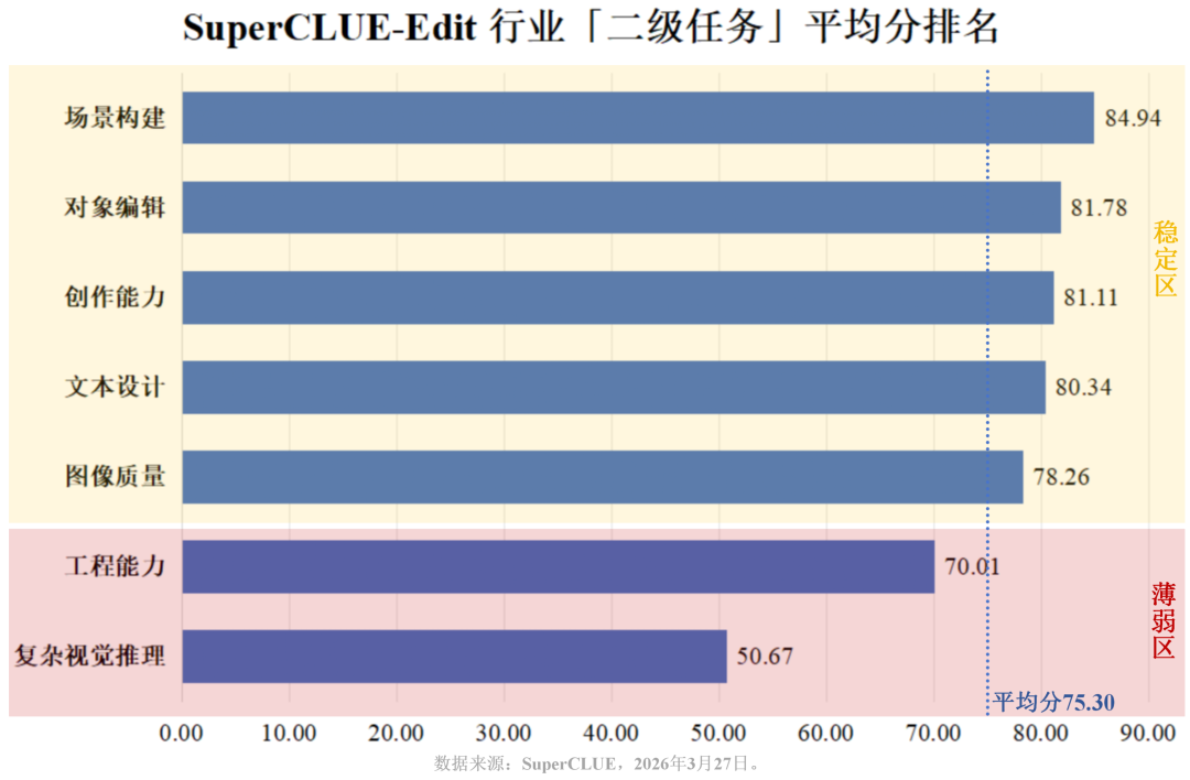 当前图像编辑模型的发展呈现出明显的“偏科”现象。从行业二级任务平均分排名来看,以视觉表现和基础操作为主的任务已经进入“稳定区”;但在深层的多模态语义对齐、严格约束以及逻辑推理上,不仅整体水平跌入“薄弱区”,且各模型之间的能力形成了极其明显的断层。