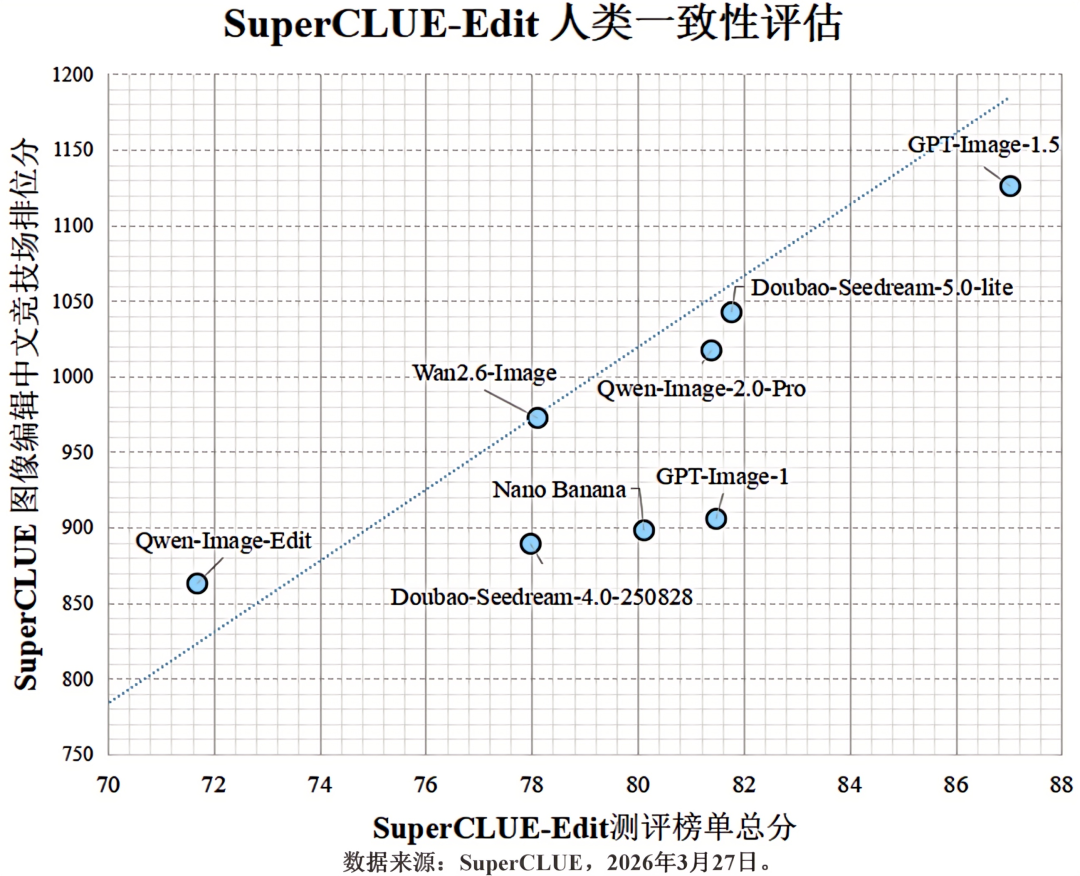 为验证测评体系的公信力,我们将SuperCLUE图像编辑中文竞技场排位分与本次SuperCLUE-Edit测评榜单总分进行交叉分析。结果显示,客观测评体系精准反映了真实用户的感官体验,具体统计指标如下: