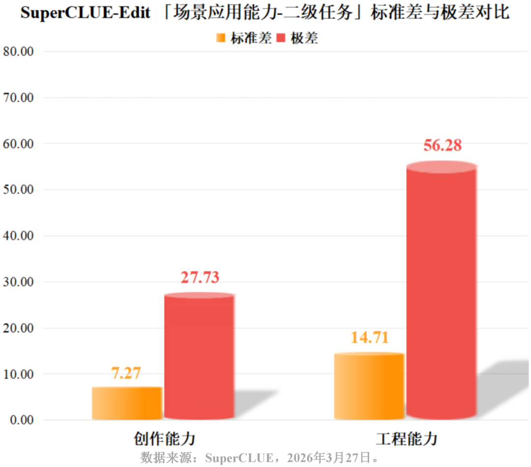 “工程能力”极差拉大至 (56.28),标准差达到 (14.71)。现象表明,当应用场景从“主观创作”转向需要满足商业交付、严格尺寸/元素控制的时候,存在许多缺乏深度优化的模型缺陷。