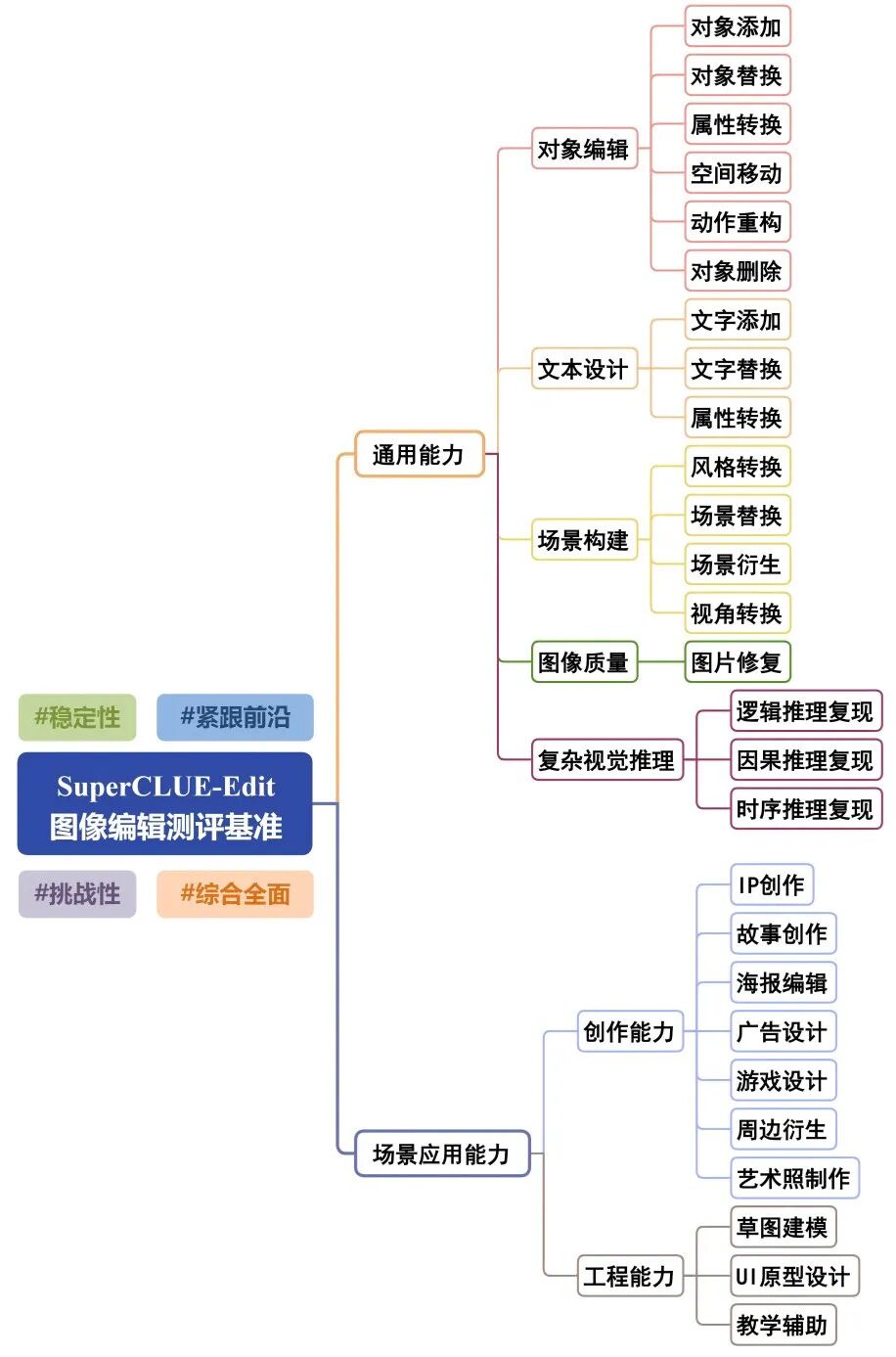 SuperCLUE-Edit 是一个聚焦图像编辑模型的基准,旨在为图像编辑领域的评估提供全面且多维的参考,覆盖通用能力和场景应用能力,涵盖28个子任务。