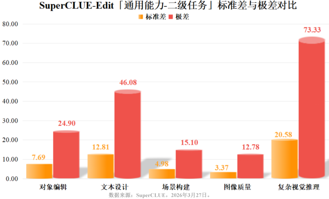 然而,在“文本设计”中,极差飙升至 (46.08),标准差达 (12.81),意味着部分尾部模型依然无法精准将文本融入图像编辑中;“复杂视觉推理”极差高达惊人的 (73.33),标准差达到 (20.58)。这暴露出当前行业现状:模型普遍擅长“把图做的好看”,但在面临需要多步逻辑计算、空间方位严格约束的复杂指令时,出现了严重的实力两极分化。
