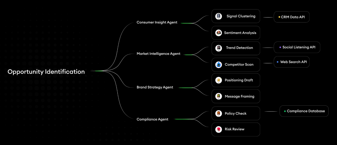 执行端不是单一 Agent 包打天下,而是 Agent Team,品牌调性、用户分析、合规审核各有专门的 Agent 协同。这些 Agent 能各司其职又保持一致,因为它们共享同一个 Context System 里的品牌语言、用户画像和业务规则。
