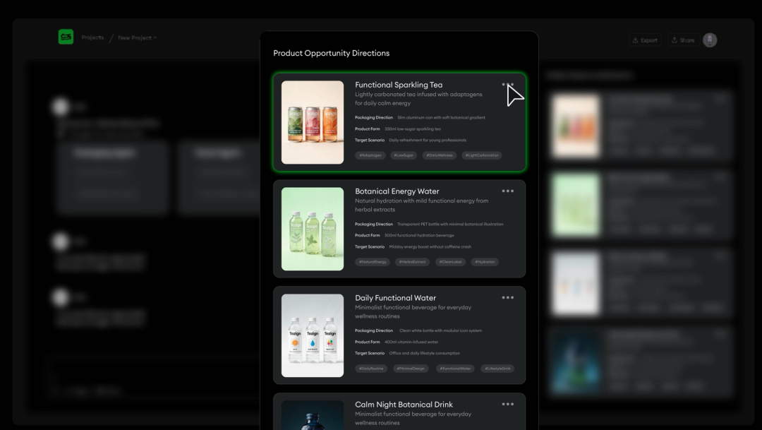 产品创新方面,GEA 参与从信号洞察到概念探索到用户验证的全链路。一个 PC 厂商每年推出数十条产品线,不缺信号,缺的是判断哪些信号值得追。GEA 通过交叉验证,把外部公开数据、用户评价、内部产品数据整合起来,把散落的信息变成经过校验的产品机会。一个食品品牌在做新口味开发时,多个 Agent 同时探索风味组合、包装设计和产品命名,产出可交付的视觉产出。