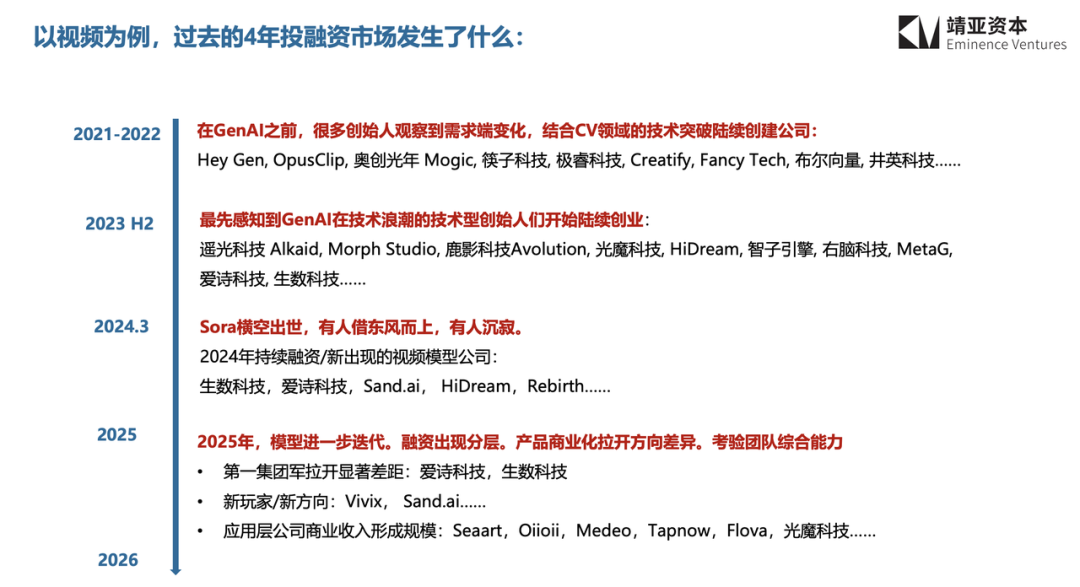 Joy在现场提到,2023年下半年,市场上出现了第一批做AI原生视频生成的公司,彼时的融资估值大致落在两千万到五千万美元之间。她谈到,其中有一家自己当时非常喜欢的公司,方向很前沿、团队技术也很强,因为考虑到视频生成模型对底层资金的需求,融资要价比较高,但由于当时国内投资人对这一方向的理解还没有完全形成共识,这个价格并没有被很好承接。等到2024年下半年它再次进入融资市场时,外部环境已经完全变了——Sora出现之后,市场情绪、资本偏好和头部效应都迅速重构,大量资金开始向更明确的头部项目集中,已经丧失了最好的市场融资窗口期。而同样类似方向的另一家创业公司,在2025年初成立,短短一年时间迅速成为独角兽。