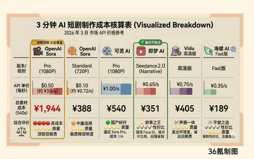 若以制作一部3分钟(180秒)的AI短剧为基准,耗片比按3:1计算(即总计调用API生成540秒素材,实际情况往往更高),Sora的性价比最低。