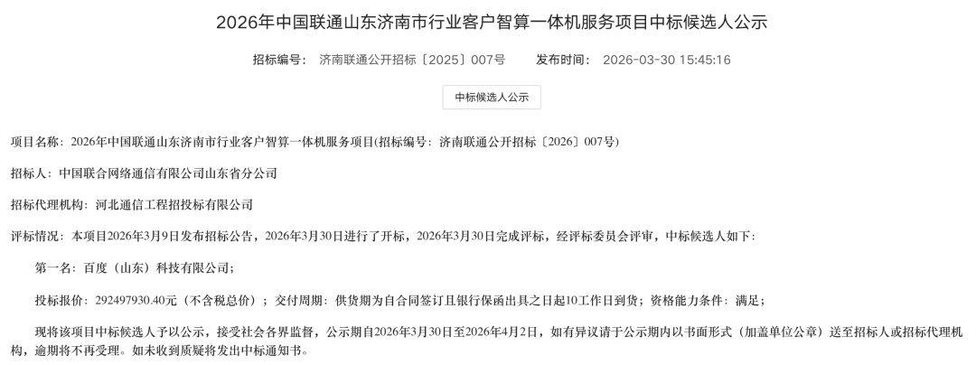 3月30日,2026年中国联通山东济南市行业客户智算一体机服务项目开标,百度(山东)科技有限公司中标,投标报价292497930.40元(不含税总价)万元。