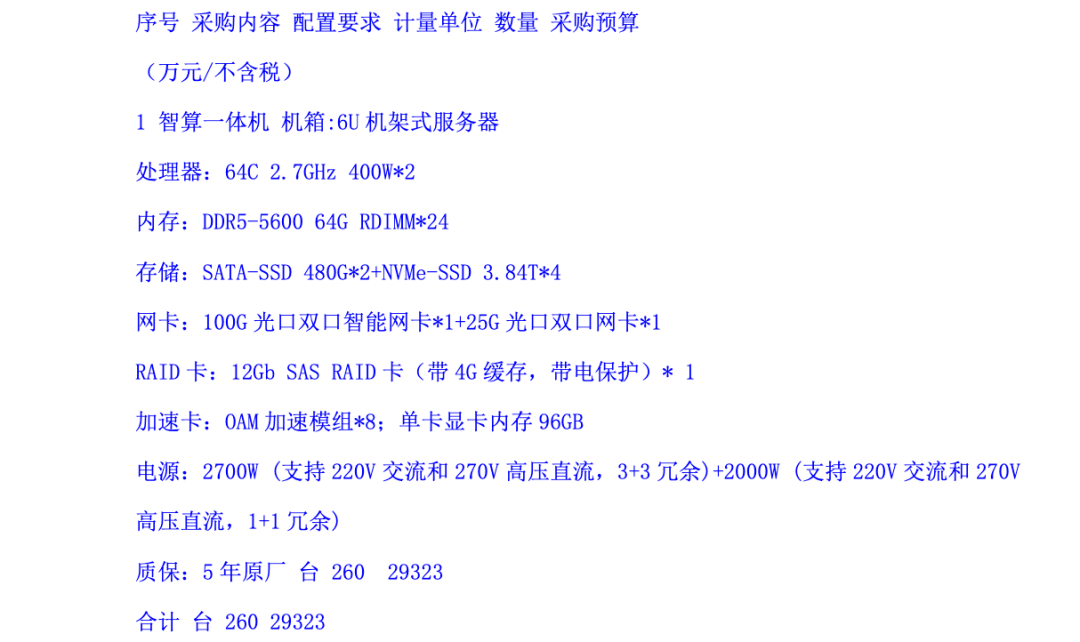 根据采购公告,本项目采购智算一体机260台,采购预算总额为29323万元(不含税)。采购一体机的配置如下: