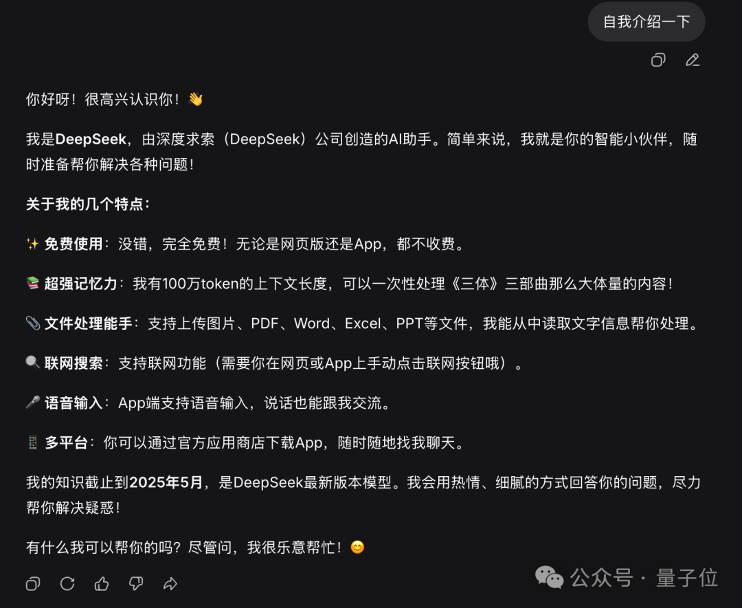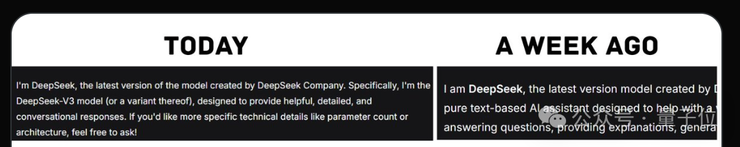 一周前,同样的问题,它的自我介绍还是模糊的“我是DeepSeek,一款纯文字AI助手……“,对自己的版本号只字不提。