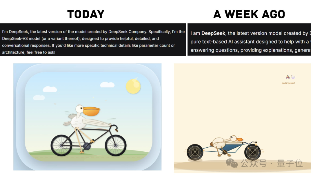 比如经典的用SVG画鹈鹕骑自行车任务,3月29日的DeepSeek,构图和色彩都明显比一周前强。